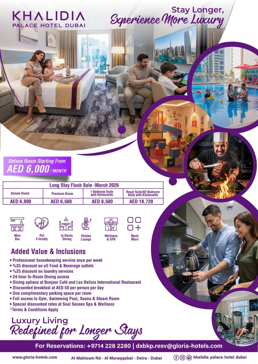Whether you’re relocating, working on a long-term project, or simply enjoying an extended stay in Dubai, Khalidia Palace Hotel offers the perfect balance between convenience and luxury.