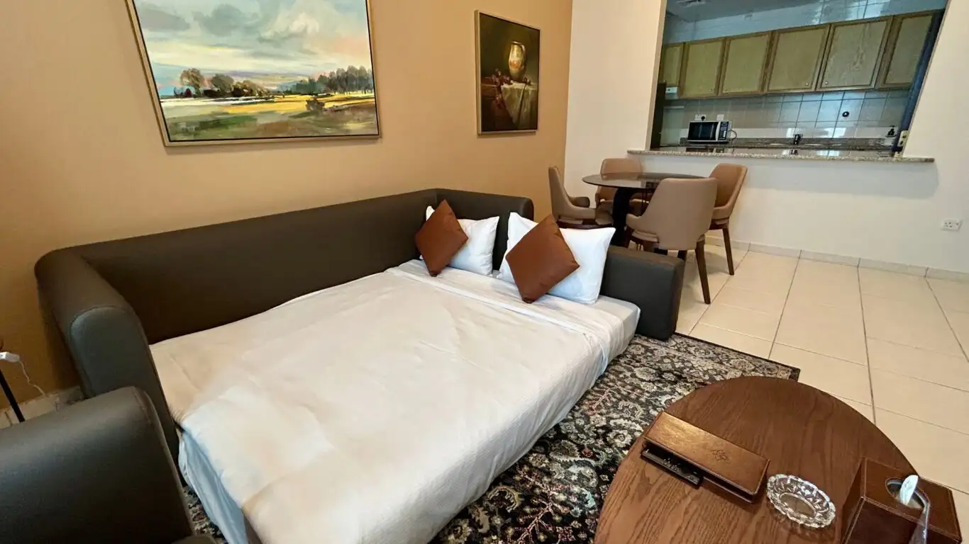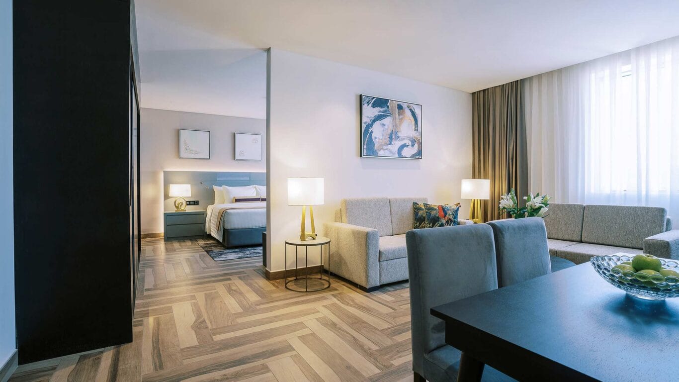 A 55 sqm apartment designed with families in mind, featuring a cozy bedroom, a spacious living and dining area, with 55’’ UHD smart TV and a fully equipped kitchen for a comfortable stay in Abu Dhabi.