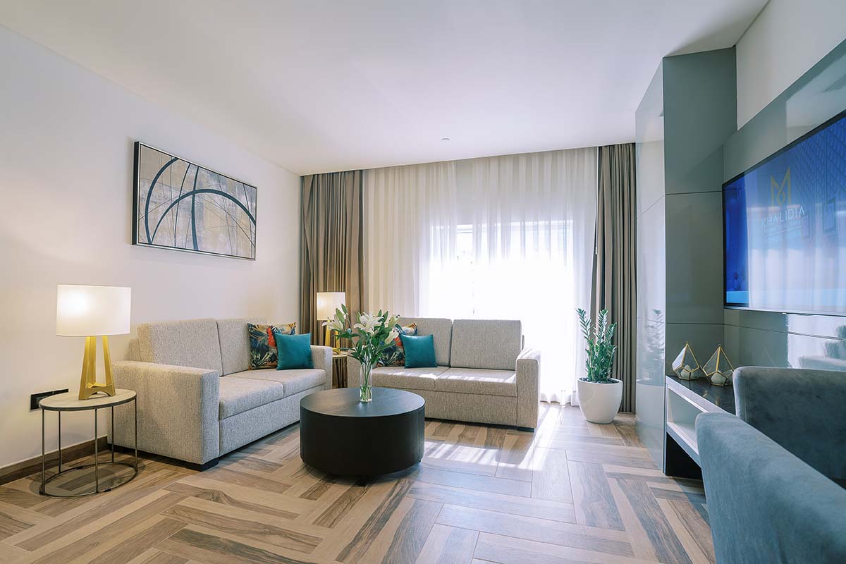 A 125 sqm two-bedroom suite with two king-size beds, a separate living room, and a fully equipped kitchenette.