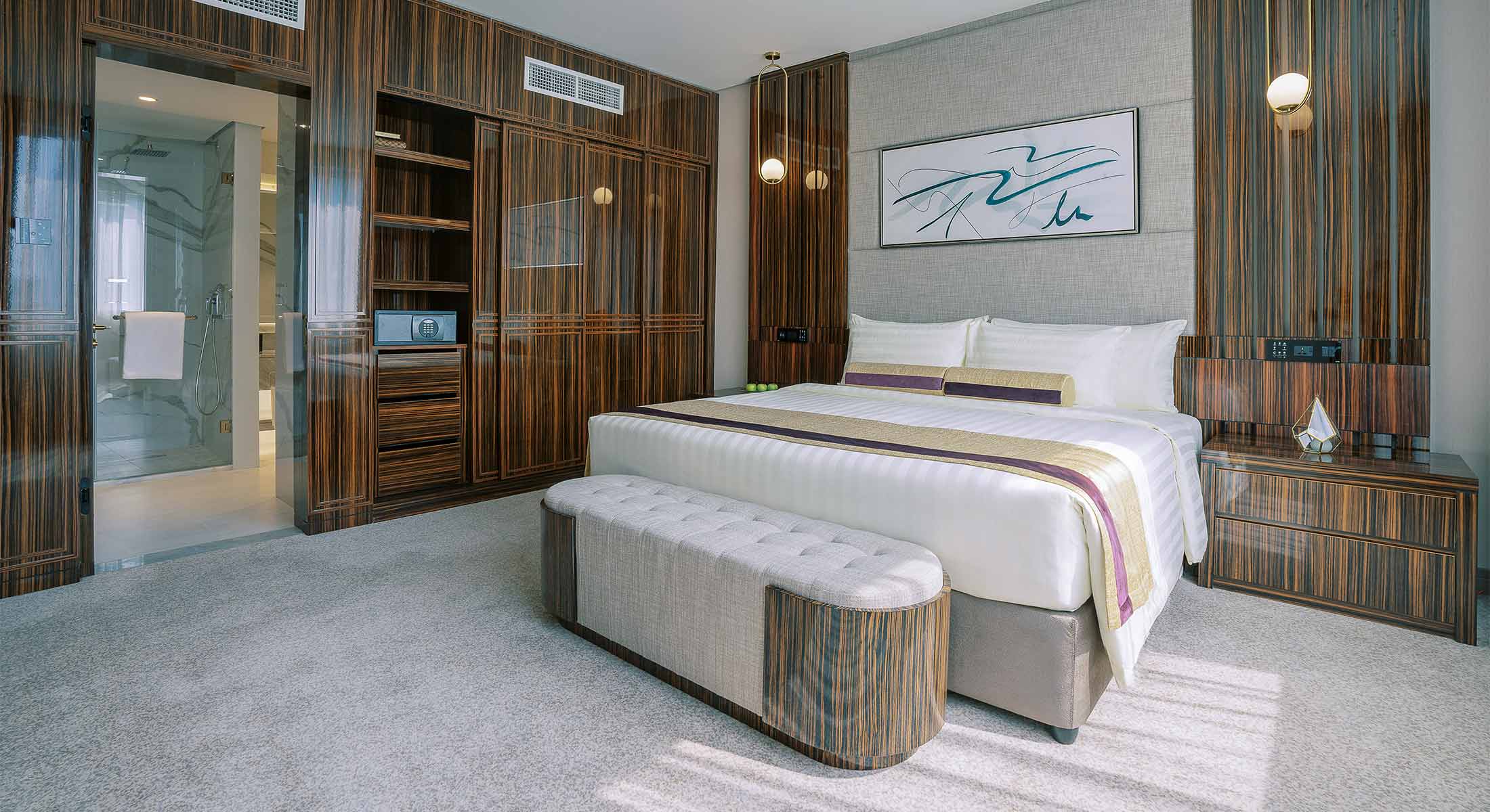 A 65 sqm suite with a master bedroom, spacious bathroom, separate living area, and a kitchenette.